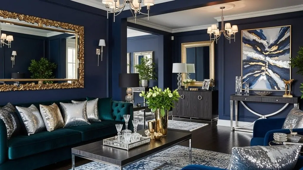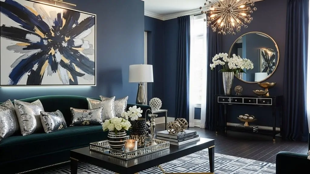 • Color Palette Perfection: Notice the striking combination of deep navy blue and shimmering silver. This classic pairing exudes luxury and sophistication. Consider adding accents of gold for an extra touch of glamour, as seen in the chic coffee table.