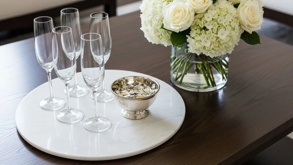 Keep it chic and simple. Use a tiered tray or a large marble platter to group champagne flutes, confetti bowls, and a bouquet of white flowers.